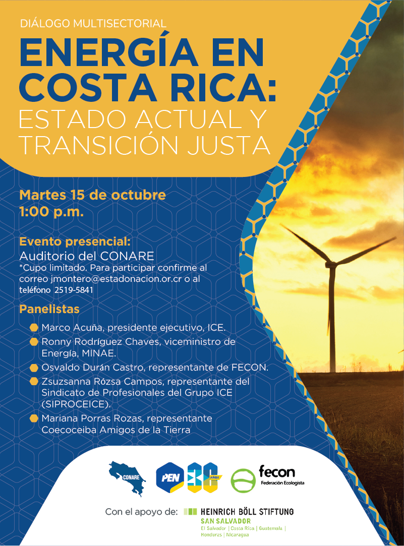 El evento se llevará a cabo en auditorio del Consejo Nacional de Rectores (CONARE) en Pavas, de 8:00 AM a 3:45PM. Se contará con una serie de expertos y representantes de comunidades que darán contenido al encuentro denominado “Diálogo multisectorial: transición energía justa en Costa Rica”. Por la mañana habrá mesas de trabajo y por la tarde un foro público.